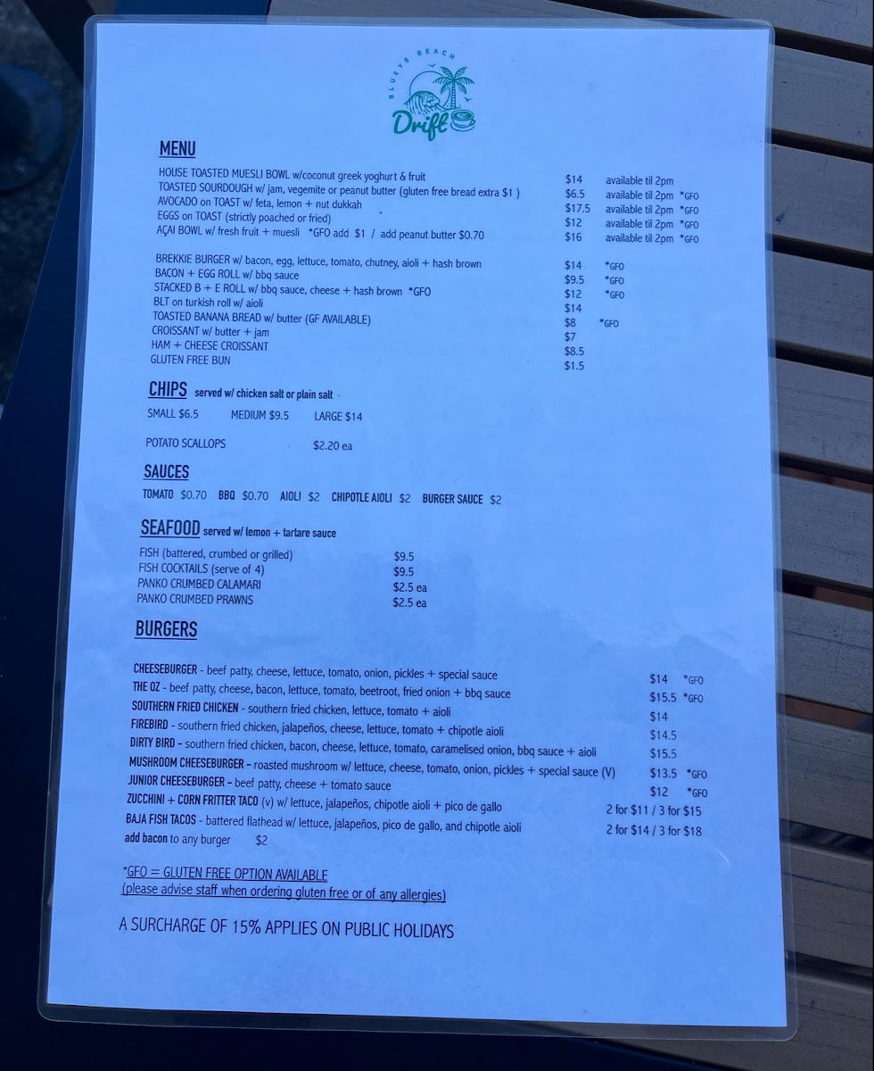 Welcome to Drift Cafe, nestled in the picturesque Blueys Beach, NSW. This vibrant cafe offers an inviting menu that caters to all taste buds. Start your day with their House Toasted Muesli Bowl or indulge in the classic Avocado On Toast for A$17.50. Those craving a heartier meal can savor the famed Brekkie Burger or delectable Bacon + Egg Roll.